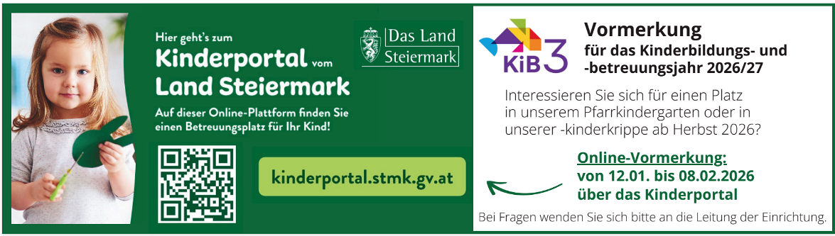 Unsere elementarpädagogische Einrichtung gehört zur Katholischen Kirche Steiermark und wird von der KiB³ - Kinder in Bildungs- und Betreuungseinrichtungen in der Diözese Graz-Seckau geführt. Erhalter ist unsere Pfarre.