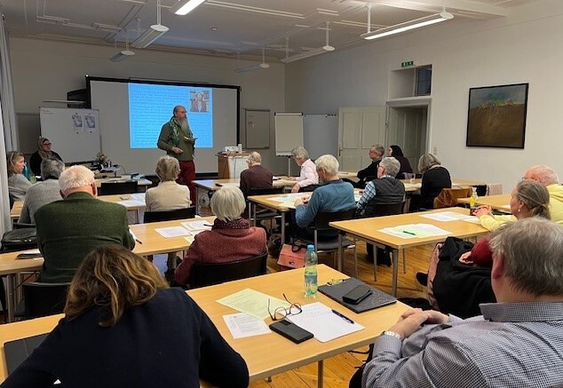 Am Folgetag lud Arnold Mettnitzer schließlich 20 Teilnehmende im Rahmen eines stärkenden Intensivseminars ein, dem Wesen und der Schönheit der Reife, ihrer unterschiedlichen Gesichter und ihrer farbenfrohen Schattierungen näher auf die Spur zu kommen. Den liebevollen Blick auf das Älterwerden gerichtet, ermutigte er, immer mit Bezug zur jeweils persönlichen Lebensgeschichte, dazu, die „gute Stunde“, die glücklichen Augenblicke zu pflegen und sich für sie offenzuhalten! Im gemeinsamen intensiven Gespräch und mithilfe literarischer Impulse – insbesondere einem Textauszug aus ,Über die Dörfer‘ von Peter Handke – wurde klar: In jedem Momente des Lebens kann das Überraschende eintreten, das „frischen Wind“ in den Alltag bläst und Freude und Zuversicht mitbringt, denn: „Unser Herz hat eine unerschöpfliche Sehnsucht nach Weltpremieren!“