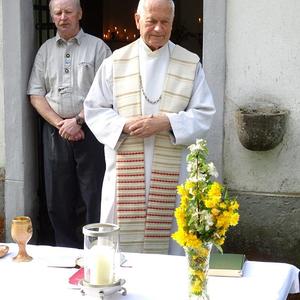 Pater Simon zelebrierte am 3. Mai, dem Festtag der Apostel Philippus & Jakobus, unter Anteilnahme von 40 Gläubigen um 9 Uhr die hl. Messe bei der idyllisch gelegenen JORDANKREUZ-KAPELLE im Pöllagraben. Der langjährige Betreuer dieses Kleinods, Hans Zink (92), der älteste Gamser, Rupert Windisch (97), Gräfin Marie Maculan und ein Gast aus Südtirol sowie einige Kleinkinder wohnten der stimmigen Messfeier bei.