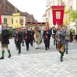 Nach der Segnung der Erntegaben folgte die Erntedankprozession mit Beteiligung der örtlichen Vereine und des Musikvereines Röthelstein sowie unter reger Teilnahme der Gläubigen über den gesamten Hauptplatz. Anschließend wurde dann der feierliche Lobgesang "Te Deum" gesungen. In der Pfarrkirche waren nach altem Brauchtum drei Erntekronen vorhanden, und zwar eine von den Bäuerinnen unter Anleitung von Anni Plienegger, eine von der Landjugend und eine vom Heimatverein Hocholma hergestellt.