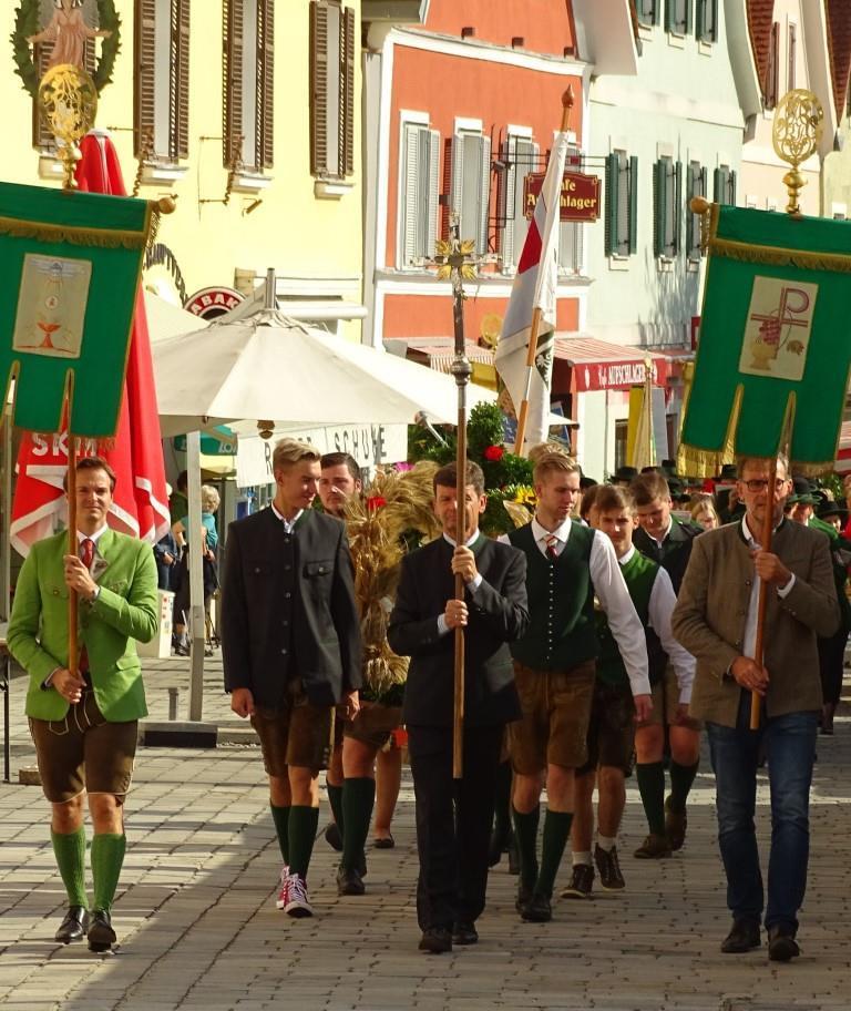Wir bedanken uns bei allen Mitwirkenden in der Vorbereitung und Durchführung dieses Festes: z.B. bei den Bäuerinnen für die große Erntekrone in der Kirche, beim Musikverein, bei allen Fahnen- und Leuchter-Trägern...