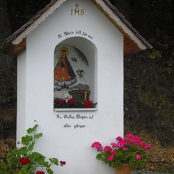 Das Andachtsbild zeigt die gekrönte Mariazeller Madonna mit dem ebenfalls gekrönten Jesuskind auf ihrem rechten Arm, künstlerisch gestaltet vom bekannten Maler Franz Kainz vlg. Tranninger aus der Gams. Als Vorlage verwendete er ein Bild, das der ehemalige Landeskonservator und Nachbar Hofrat DI Dr. Friedrich Bouvier beisteuerte. Die feierliche Einweihung erfolgte am 21. Oktober 2012, demAdriacher Kirchweihfestsonntag, durch den Übelbacher Pfarrer Dr. Horst Hüttl unter großer Anteilnahme von Familie, Verwandten, Nachbarn und Bekannten sowie mit festlicher Hausmusik.