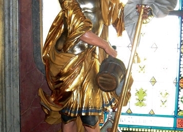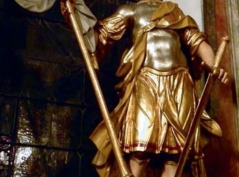 Dargestellt wird er in unserer Pfarrkirche als römischer Soldat mit einem Schwert und einer weißen Fahne mit goldenem Kreuz.
