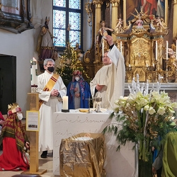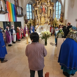 Am Christtag feierte Vikar Norbert Glaser mit der Pfarrgemeinde das Hochfest der Geburt Christi. Das Weihnachtsevangelium und seine Bedeutung für uns heute standen im Mittelpunkt des Festgottesdienstes, der vom Kirchenchor musikalisch gestaltet wurde. Unter der Leitung von Organistin Magdalena Moser wurde neben traditionellen Weihnachtsliedern eine Messe von Karl-Bernhardin Kropf gesungen, die in einstimmiger Fassung - Gotteslob 715 – von den Gläubigen mitzusingen war. So erlebten wir in unserer weihnachtlich strahlenden Kirche einen wahrlich festlichen Weihnachtsgottesdienst!