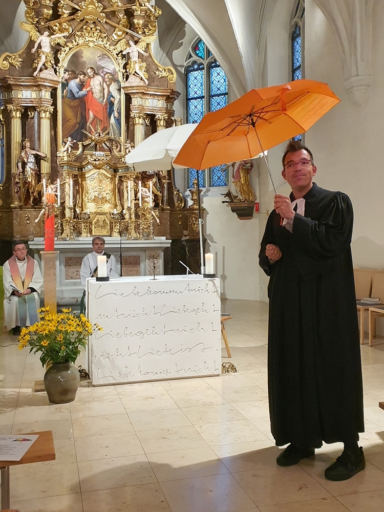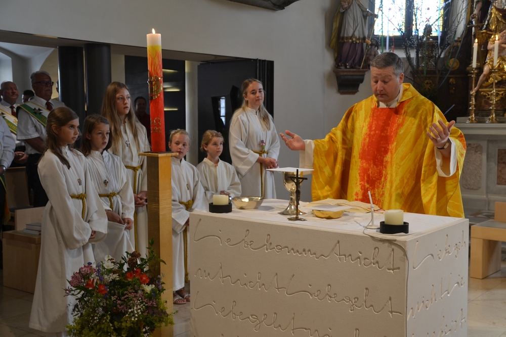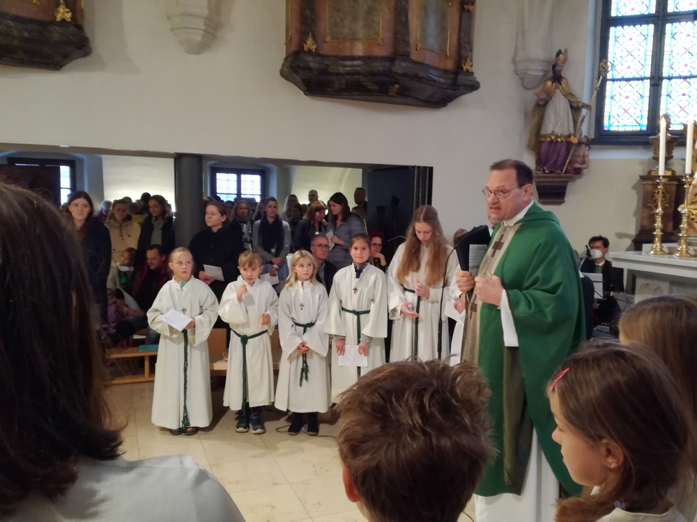 Mit dem Begrüßungssatz „Heute gießt der liebe Gott die Blumen!“, zauberte Vikar Gerhard Hatzmann – in Anspielung auf das Regenwetter – allen großen und kleinen Menschen in unserer Pfarrkirche ganz schnell ein Lächeln ins Gesicht. Eine wunderbare, fröhliche Erntedankfeier folgte.