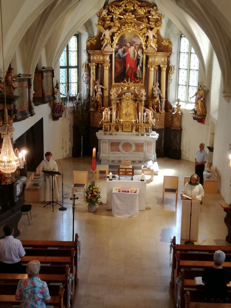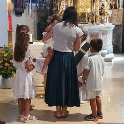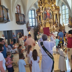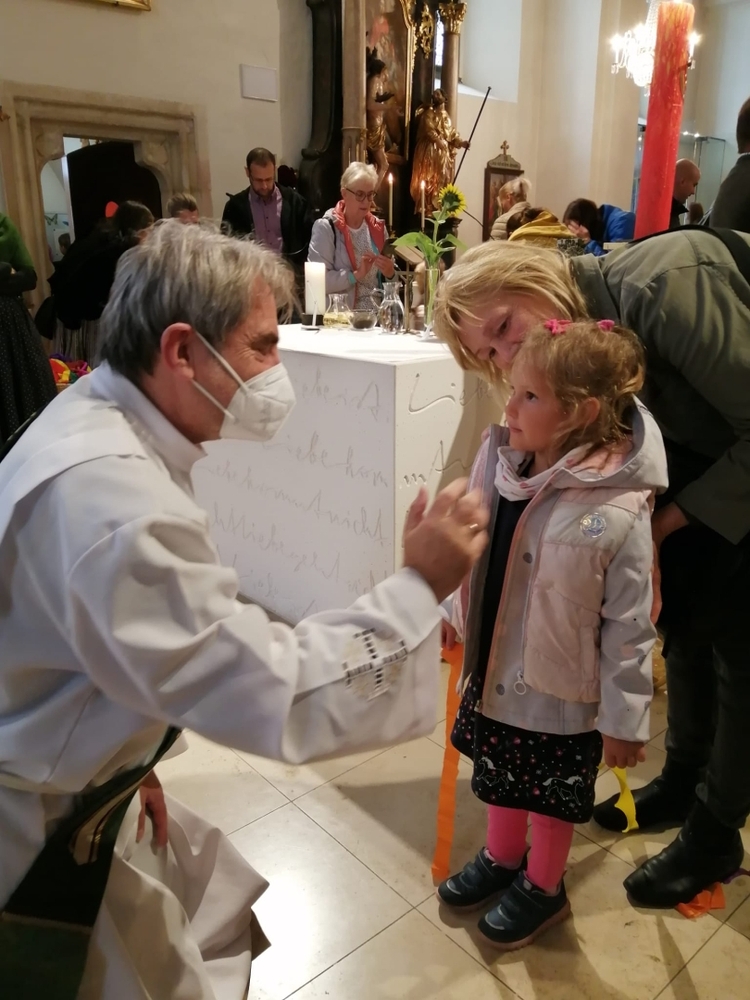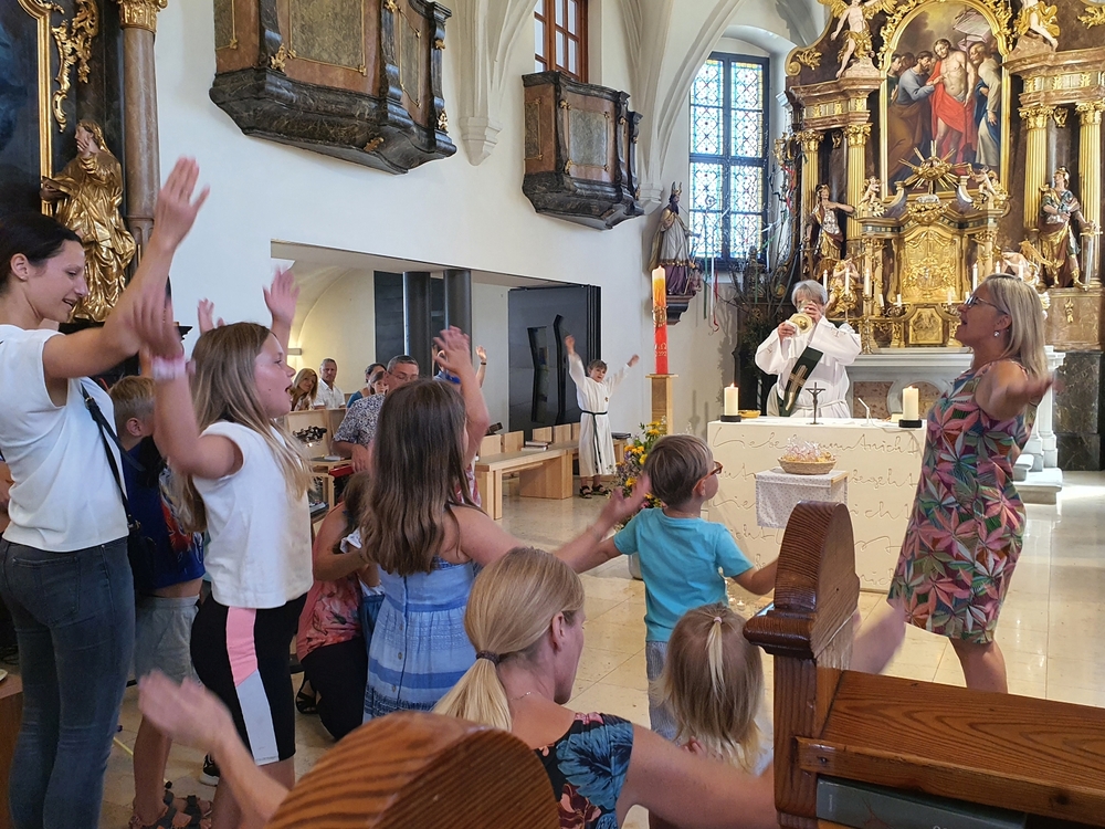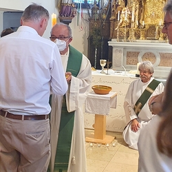 Am Sonntag den 26. Juni haben wir mit den Täuflingen der Corona Zeit einen Familiengottesdienst gefeiert. Die anwesenden Kinder wurden mit frisch gesegnetem Wasser während der Kommunionausteilung zur Erinnerung an ihre Taufe gesegnet. Die beiden Taufbewerber Mehri und Ali aus dem Iran wurden bei diesem Gottesdienst vorgestellt und mit dem Katechumenenöl gesalbt.