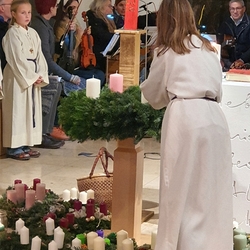 Die Christmette, dieses Mal eine Wort-Gottes-Feier mit Kommunionspendung, feierte Diakon Wolfgang Garber mit uns. In seiner Predigt lud er uns ein, es Weihnachten werden zu lassen, indem wir uns „in die Krippe unseres Nächsten“ legen, d.h. achtsam und einfühlsam mit unseren Mitmenschen umgehen, sodass „Menschwerdung“ erfahrbar wird. Stimmungsvolle Weihnachtslieder erfüllten die abendliche Kirche und die Herzen.
