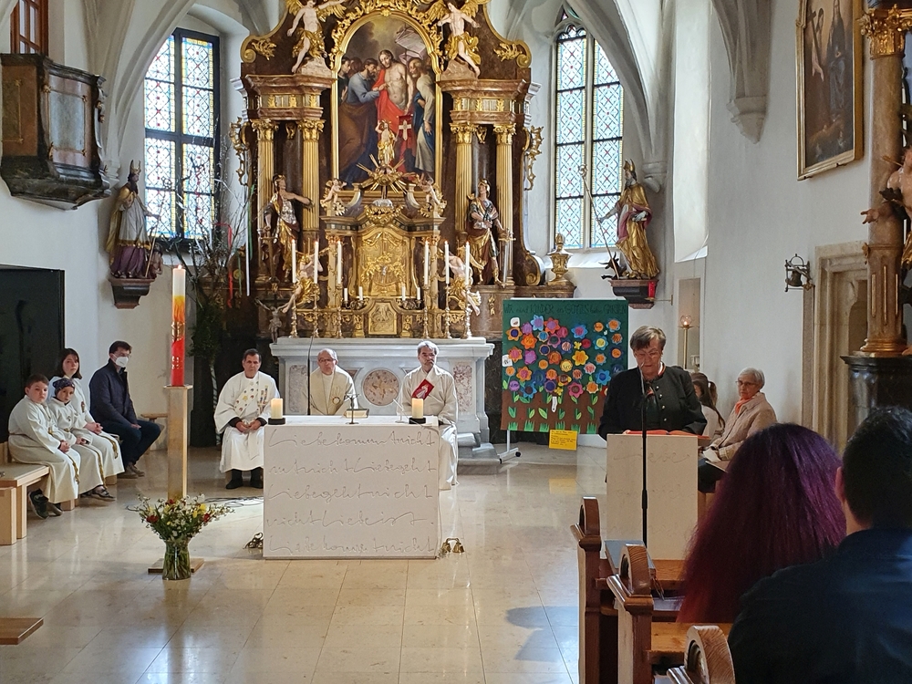 Aller Mütter und mütterlicher Menschen wurde in der Wort-Gottes-Feier am Muttertag besonders gedacht. Anja Asel, Leiterin der Feier, betonte in ihrer Predigt die Ähnlichkeit von mütterlichem Handeln mit dem Wirken des „Guten Hirten“, wie es im Tagesevangelium aufgezeigt wird. Das Ritual der Händesalbung hob schließlich das segensreiche Tun mütterlicher Hände besonders hervor. Kraft und Segen wurden zugesprochen und mit auf den Weg gegeben. In Marienliedern erging auch das Lob an die Mutter aller Mütter, die Gottesmutter Maria.
